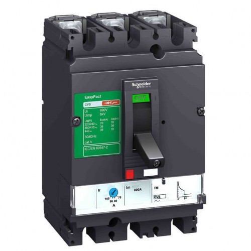 Трехполюсные автоматические выключатели серий EasyPact CVS100, CVS160 и CVS250, обеспечивая дифференциальную защиту, предназначены для защиты цепей от перегрузок и коротких замыканий, а также для защиты электродвигателей. Данная серия имеет диапазон номинальных токов от 16 до 250 Ампер при номинальном рабочем напряжении до 440 В AC. Отключающая способность автоматов (ток отключения) от 20 кА (при 440В) до 70 кА при 220 В. Степень защиты корпуса IP40, IK07. Простой монтаж в шкафах без использования специального инструмента.