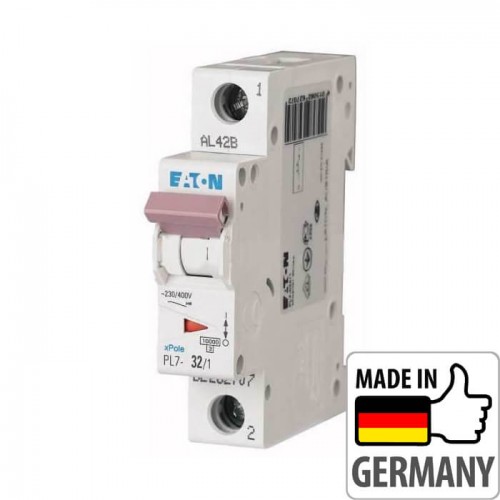 Автоматичний вимикач EATON серії PL7 призначений для захисту електричних ланцюгів від струмів короткого замикання та перенавантаження. Легко монтується на DIN-рейку, прямокутний індикатор положення контактів (увімкнено / вимкнено), можливість підключення додаткових пристроїв. Індикації номінального струму автоматичного вимикача - кольором керуючого важеля (у кложного намінала свій окремий колір). Автоматичні вимикачі серії PL7 дозволяють підводити живлення як зверху так і знизу.